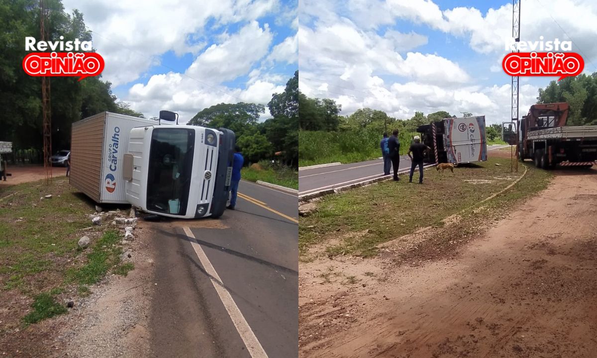 Um caminhão baú pertencente à empresa do ramo de supermercados R Carvalho, com filial em José de Freitas, tombou na manhã desta quinta-feira (12) na PI-113, na altura da localidade Lagoinha.