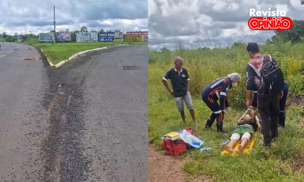 De acordo com informações, o condutor perdeu o controle da motocicleta ao passar por buracos no asfalto e pedras de brita espalhadas na pista, o que teria provocado a queda. Com o impacto, ele sofreu diversas escoriações e acabou caindo às margens da rodovia.